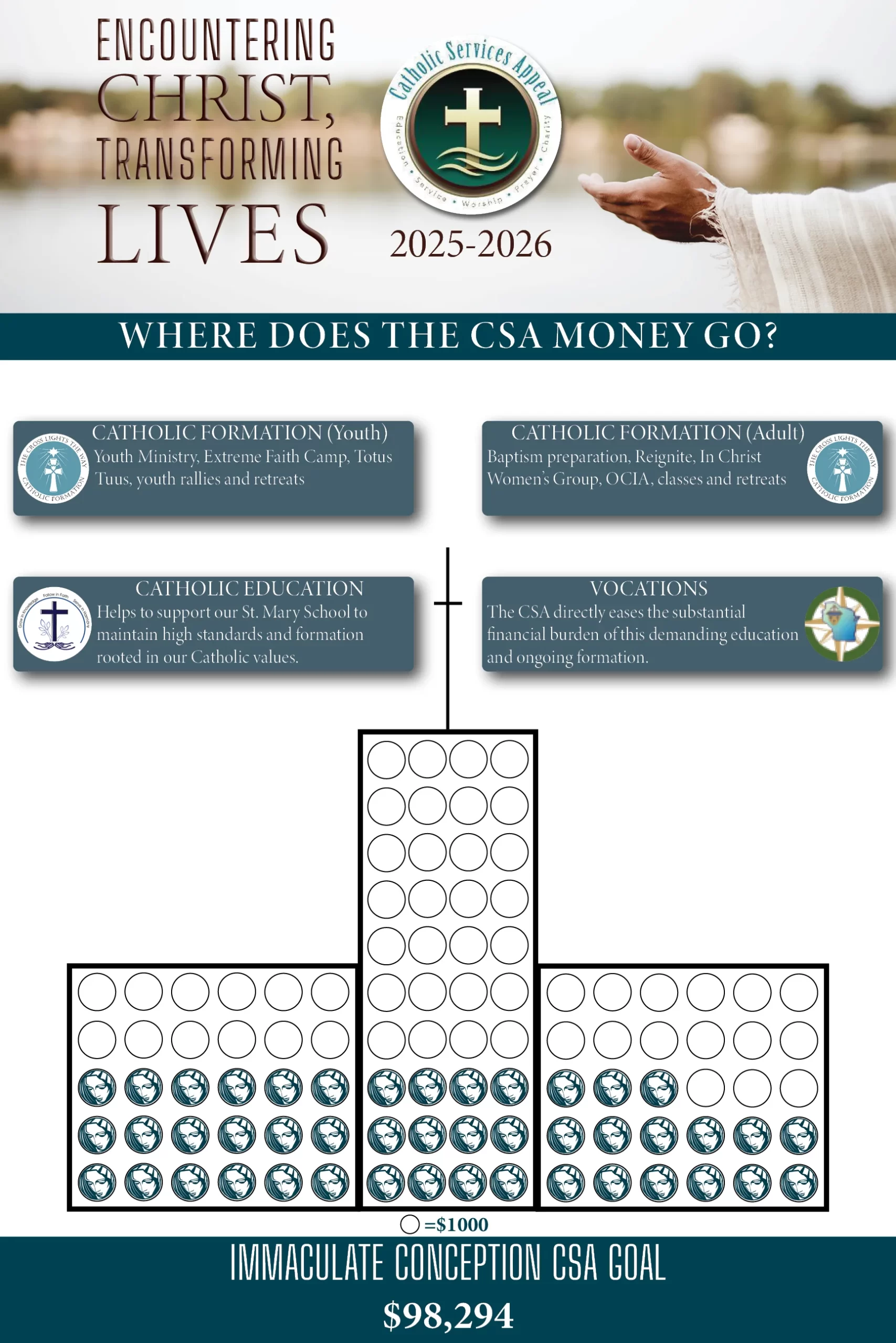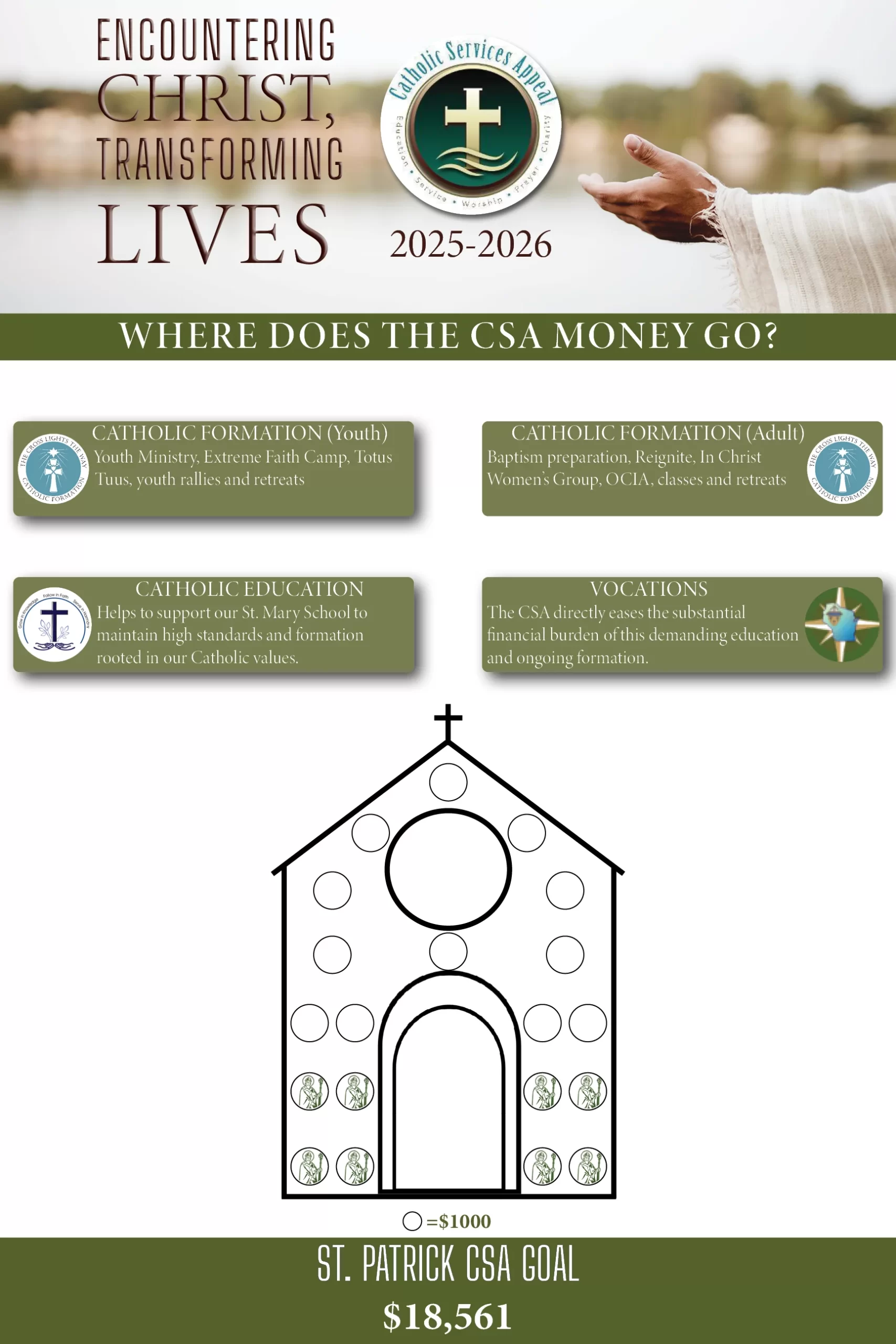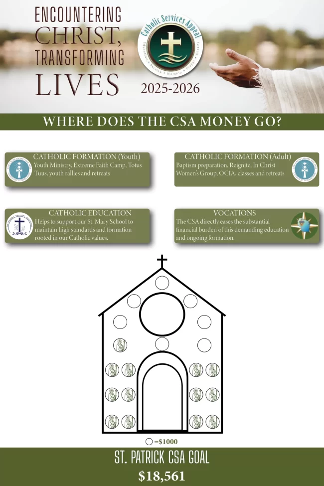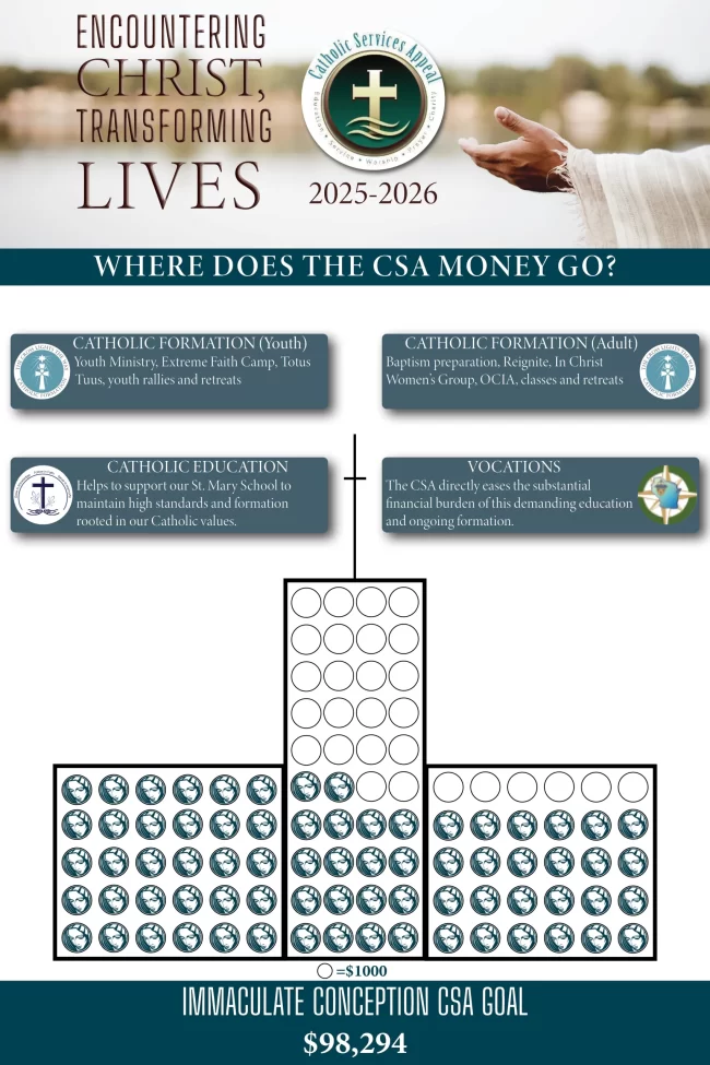 The 2025/2026 Catholic Services Appeal was held in September of 2025 in our parish. The Appeal is an opportunity for us, as a faith family, to join together to do the work of the Lord. All of our families are encouraged to support the Catholic Services Appeal. By giving to the Catholic Services Appeal, you are answering God’s call to discipleship to put the work of God before your own needs. The Church serves each of us in some way, and our financial support is needed to continue God’s work in our area. In addition, every dollar contributed to the appeal assists our parish in offsetting our yearly diocesan assessment responsibility to our diocesan church. When you contribute to the CSA, you help families, young adults, senior citizens, students, and the entire parish.