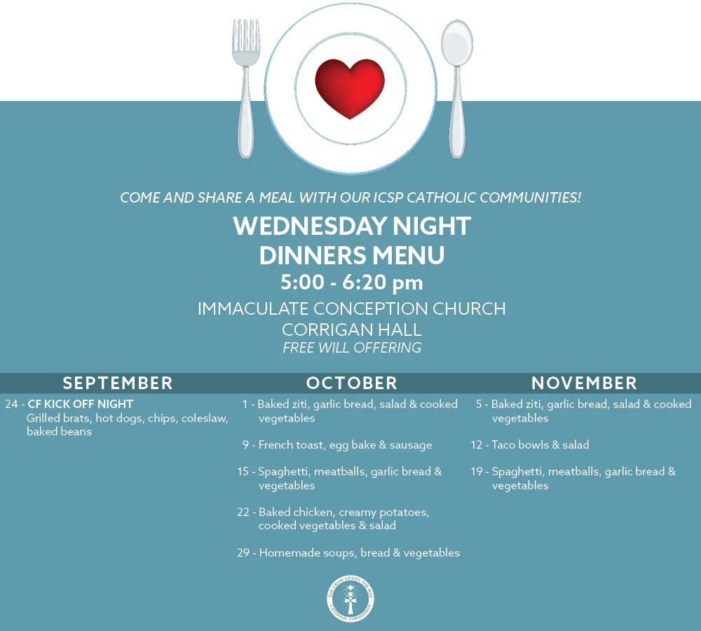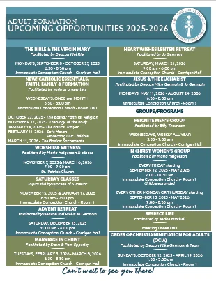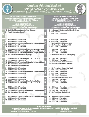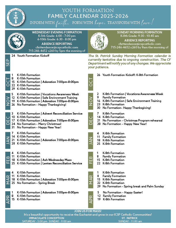 Preparation for the Sacrament of Reconciliation includes two mandatory large group parent/child events to re-enforce and enhance the lessons taught at home, at Catholic Formation and Catholic school. Details with more information will be given at the required scheduled meetings. For more information, please contact Kristin Dittman at 715-246-4652 ext 260 or k.dittman@ic-church.com.